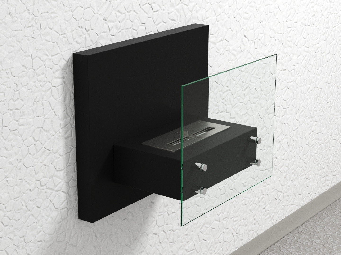 Представляет собой сборный металлический каркас с топливным блоком Lux Fire 300 М, закрепленный на 4 дистанционных держателях к защитному стеклу с подвесом к стене.Идеально подходит для интерьеров домов и квартир, релакс-зон бань и саун когда уже сделан ремонт в помещениях средней площади от 18 м2