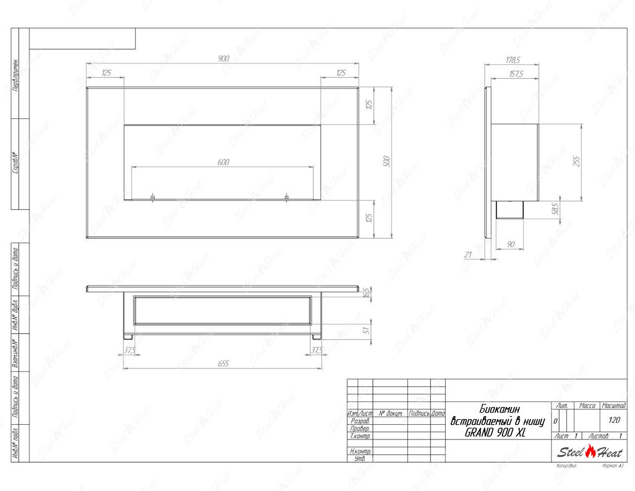 Встраиваемый Биокамин SteelHeat GRAND900 XL предназначен для встраивания в глухие ниши из гипсокартона, кирпича, пеноблоков, бетона.